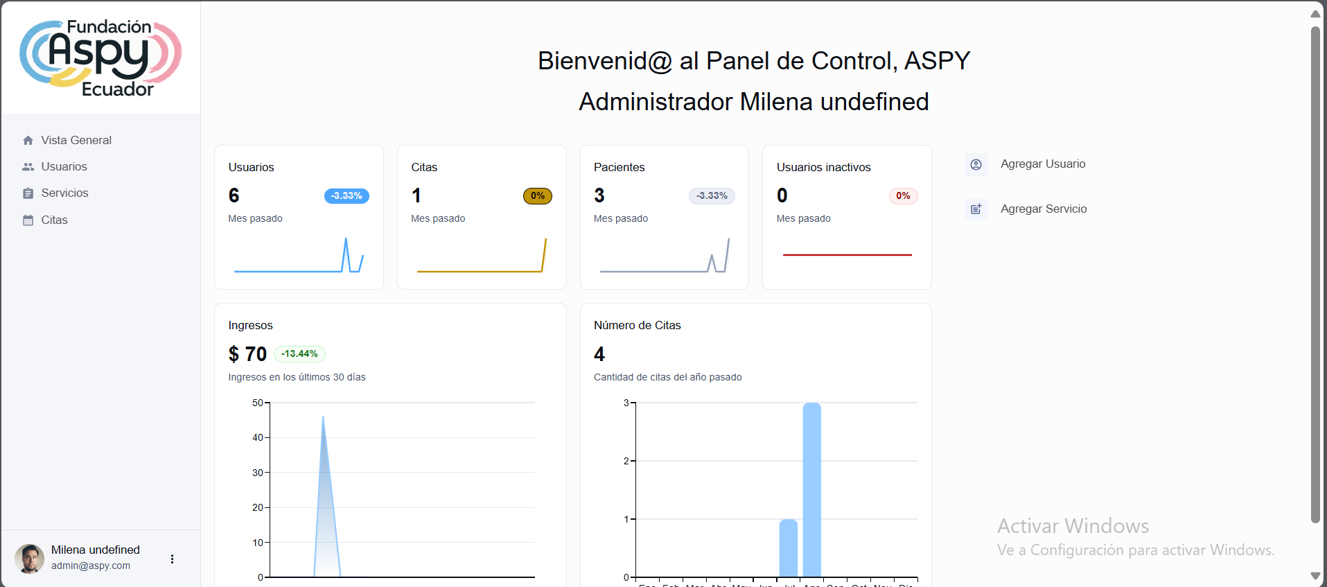 - Es una aplicación web desarrollada en React, diseñada para que los pacientes de la Fundación Aspy puedan agendar y gestionar sus citas médicas de forma rápida y sencilla. La plataforma permite a los administradores, secretarios y profesionales de la salud organizar los horarios y mantener un control centralizado de las atenciones, mientras que los pacientes pueden seleccionar el servicio, el profesional y la fecha de su cita de manera intuitiva. Los profesionales pueden generar reportes médicas de las citas.